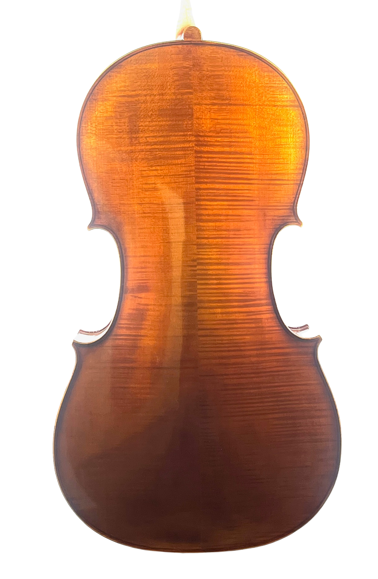 A master made cello from the Bieg Workshop in Bubenreuth, Germany. Handcraftedby the German company Bieg Geigenbau (Bieg Violin Making) in Bubenreuth, Germany. The model is after the famous Duport Stradavarius cello of the year 1711. This cello is made from the finest Bosnian maple and Carpathian spruce. Varnished in the traditional German spirit varnish in a translucent orange/amber hue.