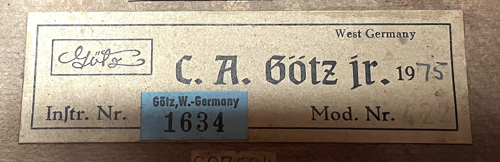German cello imported by C. A. Gotz company from Bubenreuth Germany in 1975. A good quality workshop cello in good condition. European maple back and top. Ebony fingerboard. A good example of good student instruments from Germany in the later-mid 20th Century