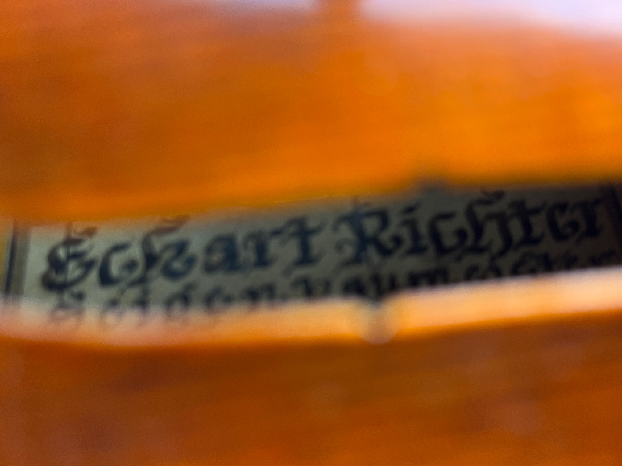 German violin by Eckart Richter, Markneukirchen, 2002. Eckart Richter was born in 1936 and apprenticed with Werner Voight and then worked with Willi Linndorfer in Weimar in the 1950s. This violin is oil varnished in a beautiful deep orange color over a broad flamed one piece maple back. A fairly modern violin made in the style of the Markneukirchen masters of the early 20th century.