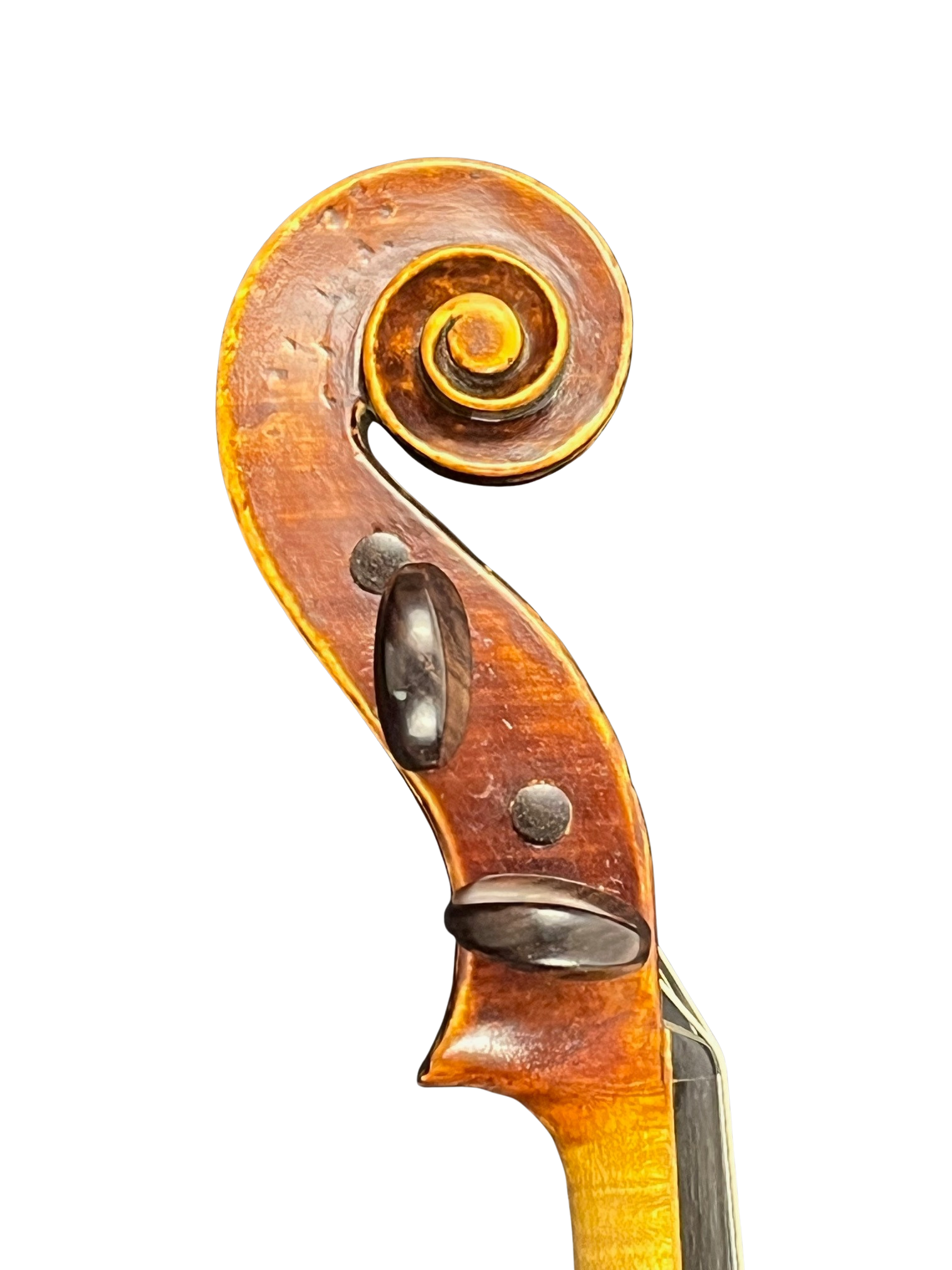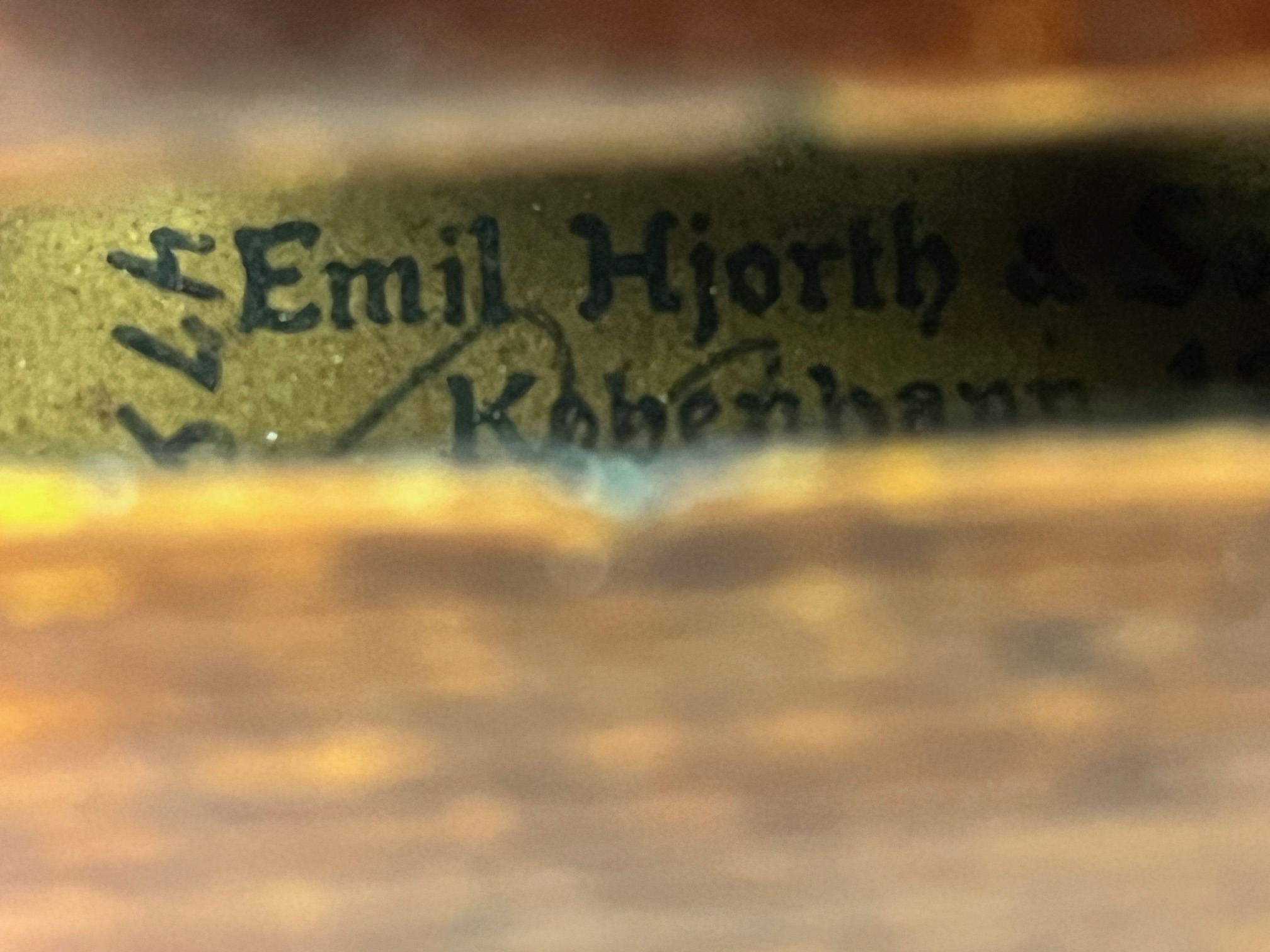 Fine violin by Emil Hjorth and Son, Denmark 1955. Deep brown oil varnish over amber ground. Nicely flamed European maple back and European spruce top. A beautiful violin with a gorgeous tone
