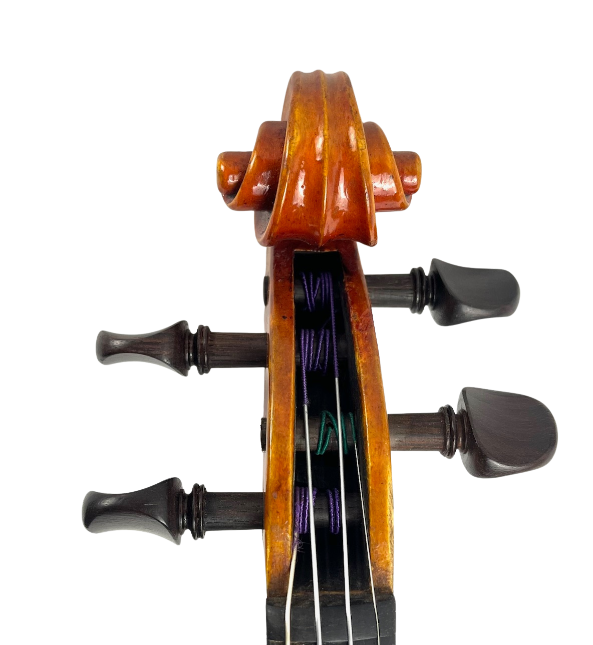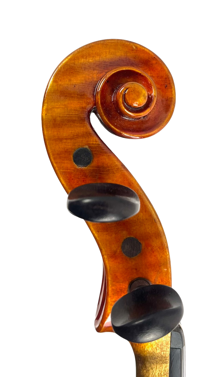 Bohemian violin by Franciscus Podlaha 1933. A stunning Orange/Yellow spirit varnish highlights a gorgeous highly flamed European maple One Piece back. This violin is in great condition with a brilliant, responsive tone that responds quickly and easliy