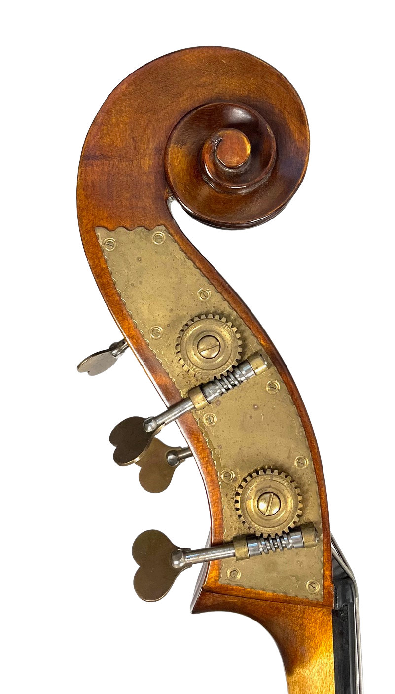 Double bass handmade in Mohrendorf, Germany in 1995 by the Emanuel Wilfer Co for export by Gotz GmbH. Fine European wood hand varnished in a traditional spirit varnish unique to the Wilfer family. Round back, violin model