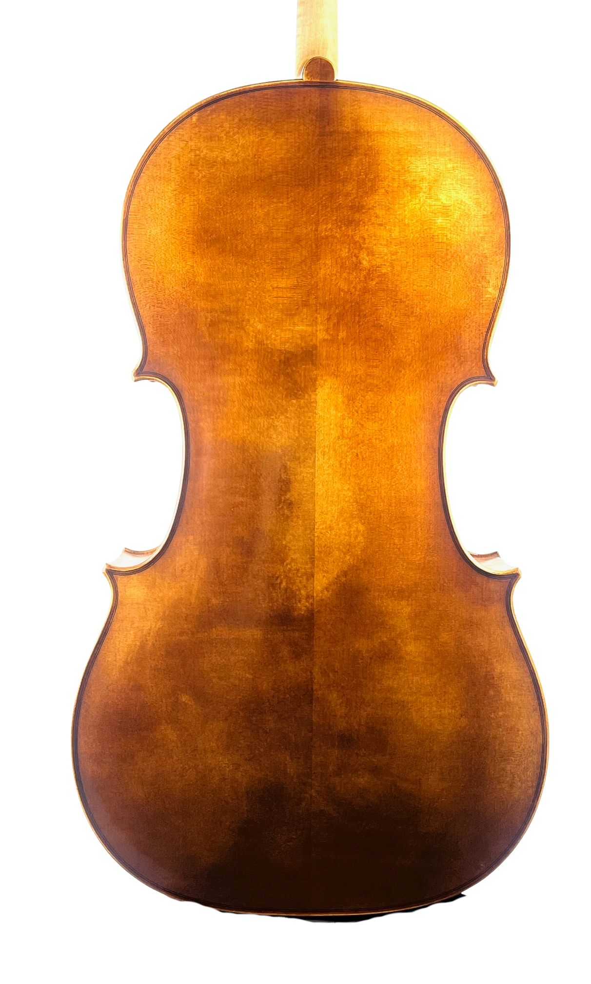 nicely flamed European maple, European Spruce top, orange-brown antique handvarnish on amber primer. Copy of Antonio Stradivari forma B pattern. A fine advanced cello for collegiate or semi-professional performance