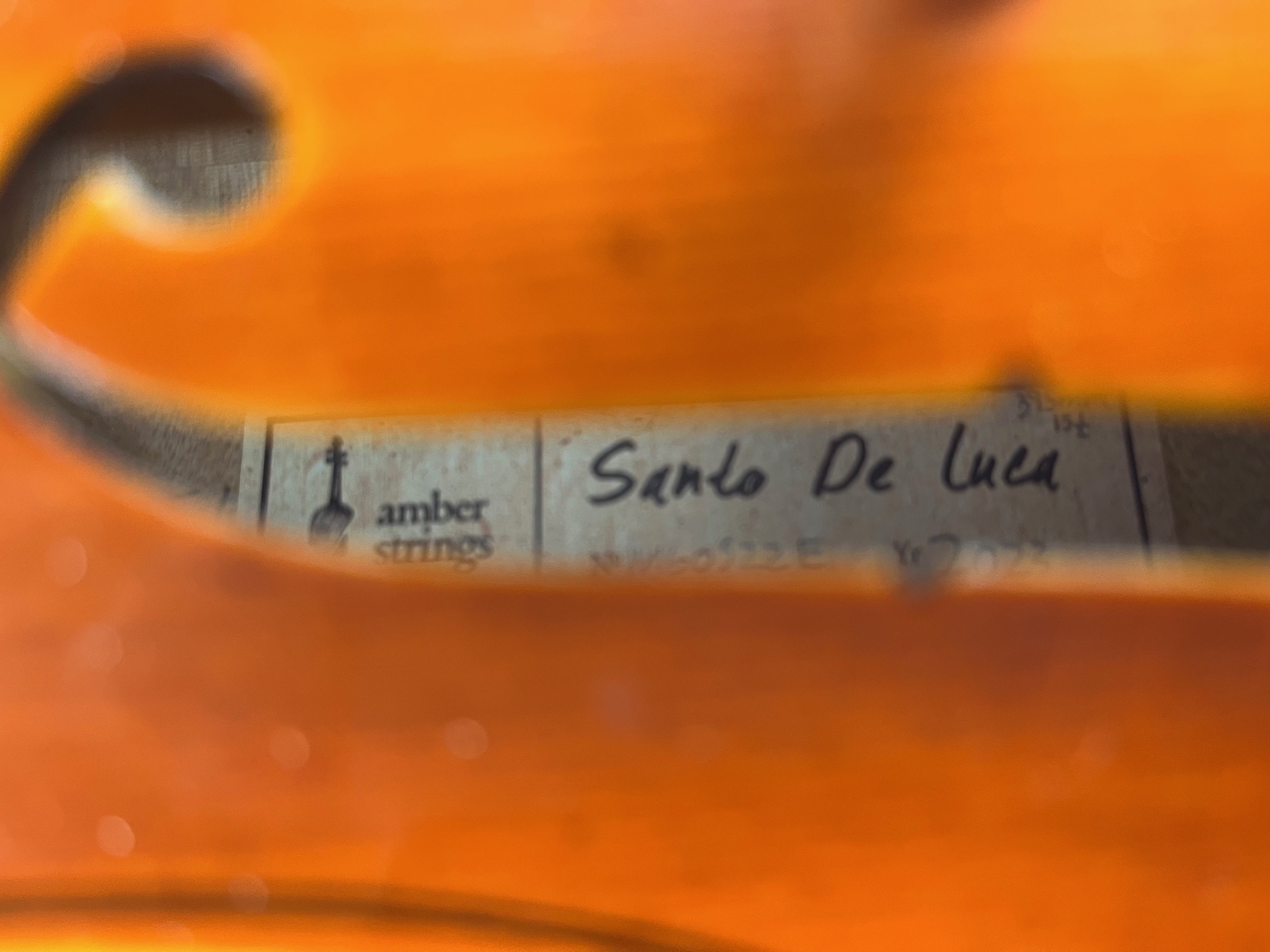 15 1/2" Viola. Santo de Luca, imported by Amber Strings from Beijing. Handmade viola with broad flamed maple back and gently antiqued varnish. Set up with Helicore strings by Hammond Ashley Violins